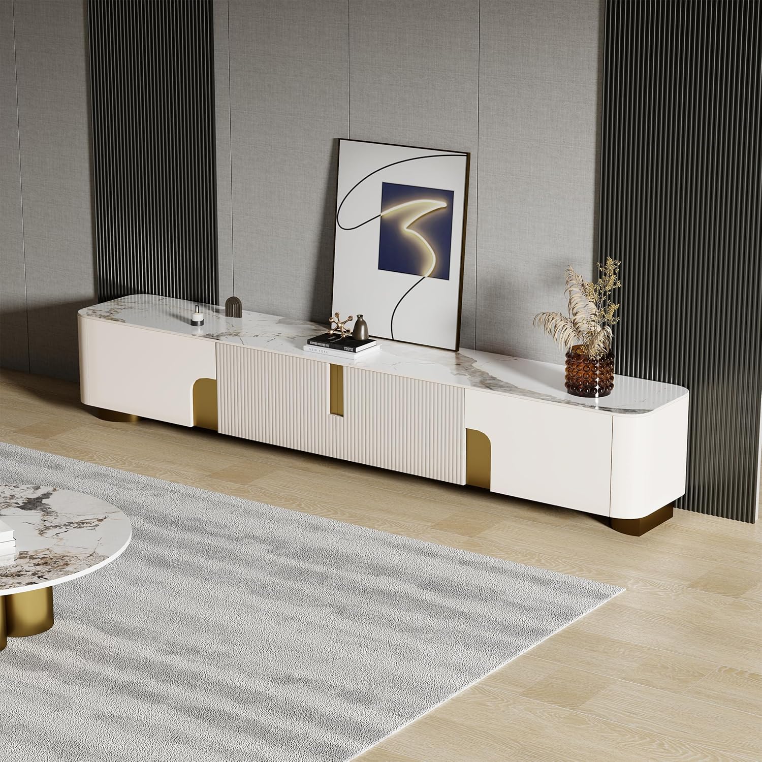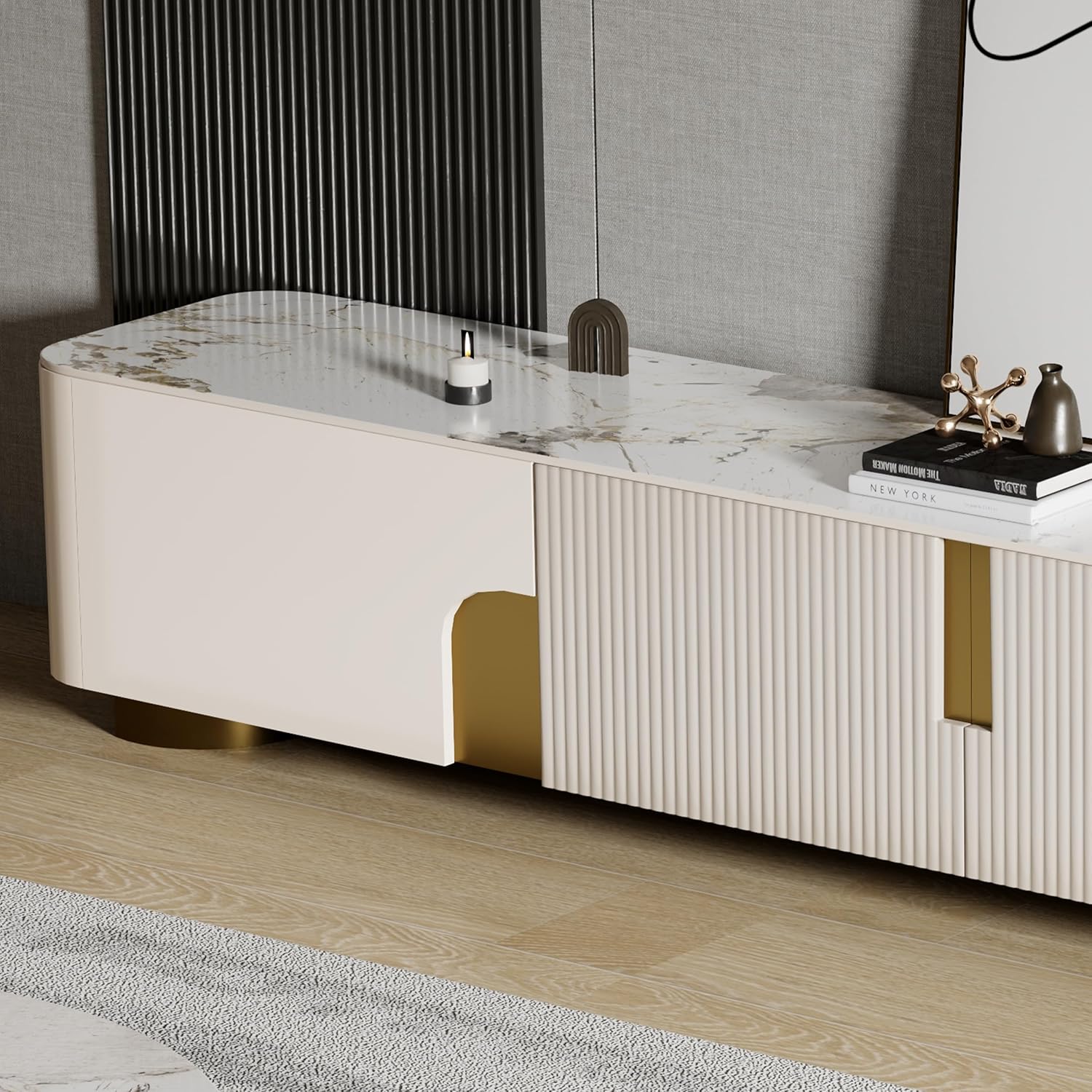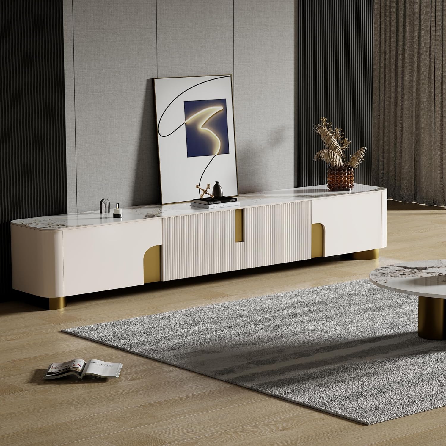 This TV cabinet features a sleek modern design with a unique textured sintered stone tabletop, exuding elegance and luxury, which is scratch-resistant, heat-proof, waterproof and easy to clean. With ample storage and excellent craftsmanship, including arc-corner design for safety and a piano paint finish, it's practical and beautiful.It's a ideal choice for any home entertainment setup.