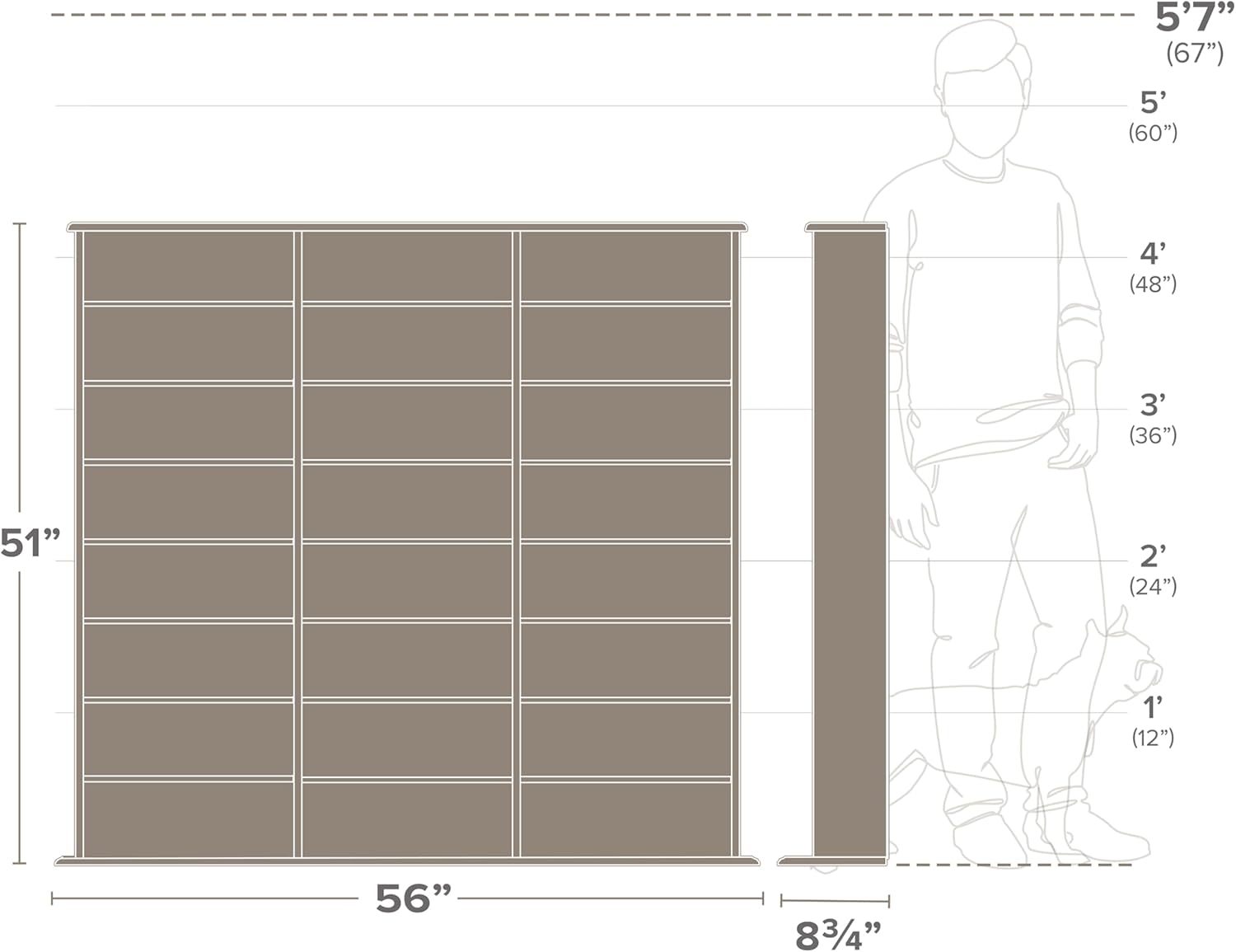 Maximize your media storage capabilities and elevate your organization with the Triple Width Wall Storage, an ideal solution for collectors and entertainment enthusiasts alike. Measuring 8.75” D x 56” W x 51” H, this impressive multimedia cabinet offers a generous library-style design with three separate compartments, ensuring ample space for DVDs, CDs, Blu-rays, video games, and more. Each compartment features fully adjustable shelves, allowing you to tailor the configuration to suit your collection’s unique requirements. The horizontal storage format makes it easy to sort, access, and expand your media library as it grows, providing unparalleled convenience and organization. Constructed with high-quality, non-toxic, CARB-2-compliant laminated composite woods, the CD storage combines durability with sleek aesthetics. The sturdy shelves and reinforced structure ensure long-lasting performance, while its modern design seamlessly integrates with any home décor. This media storage unit not only serves as a functional piece but also enhances the visual appeal of your living room, home office, or entertainment space. Its versatile design makes it an excellent choice for a variety of media types with ease. The carefully crafted compartments and premium materials make this unit as reliable as it is attractive. In addition to its storage capabilities, the Triple Width Wall Storage is perfect as an entertainment center with shelves, creating a sleek and organized focal point in your entertainment area. The spacious DVD storage cabinet and customizable shelving options allow you to display your media collection while maintaining a clean and polished look. Made in the USA & Canada, this unit is backed by a 5-year limited warranty, reflecting its superior craftsmanship and commitment to quality. Transform your living space and enjoy a clutter-free, stylish setup with the Triple Width Wall Storage, designed to enhance your media organization and elevate your home décor.