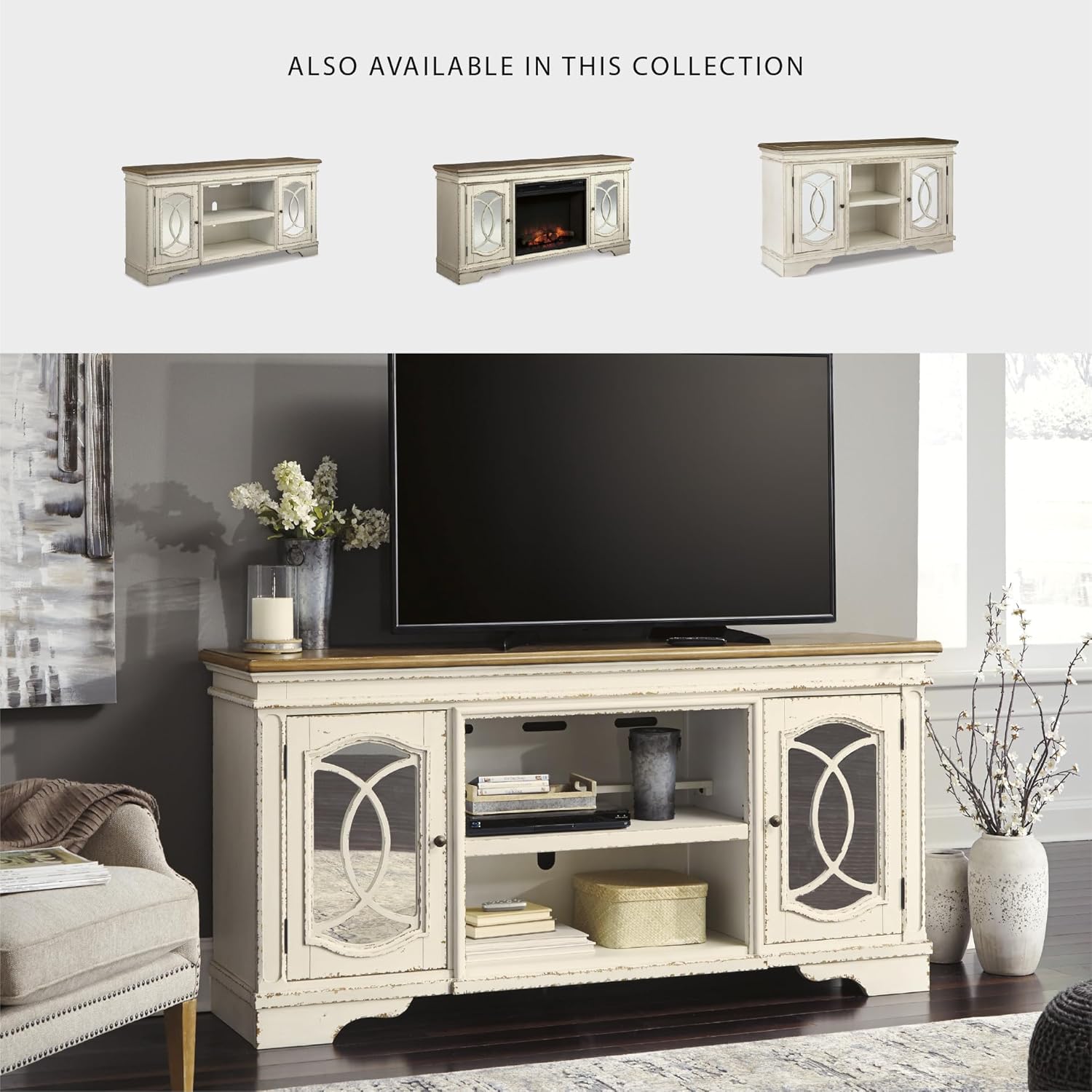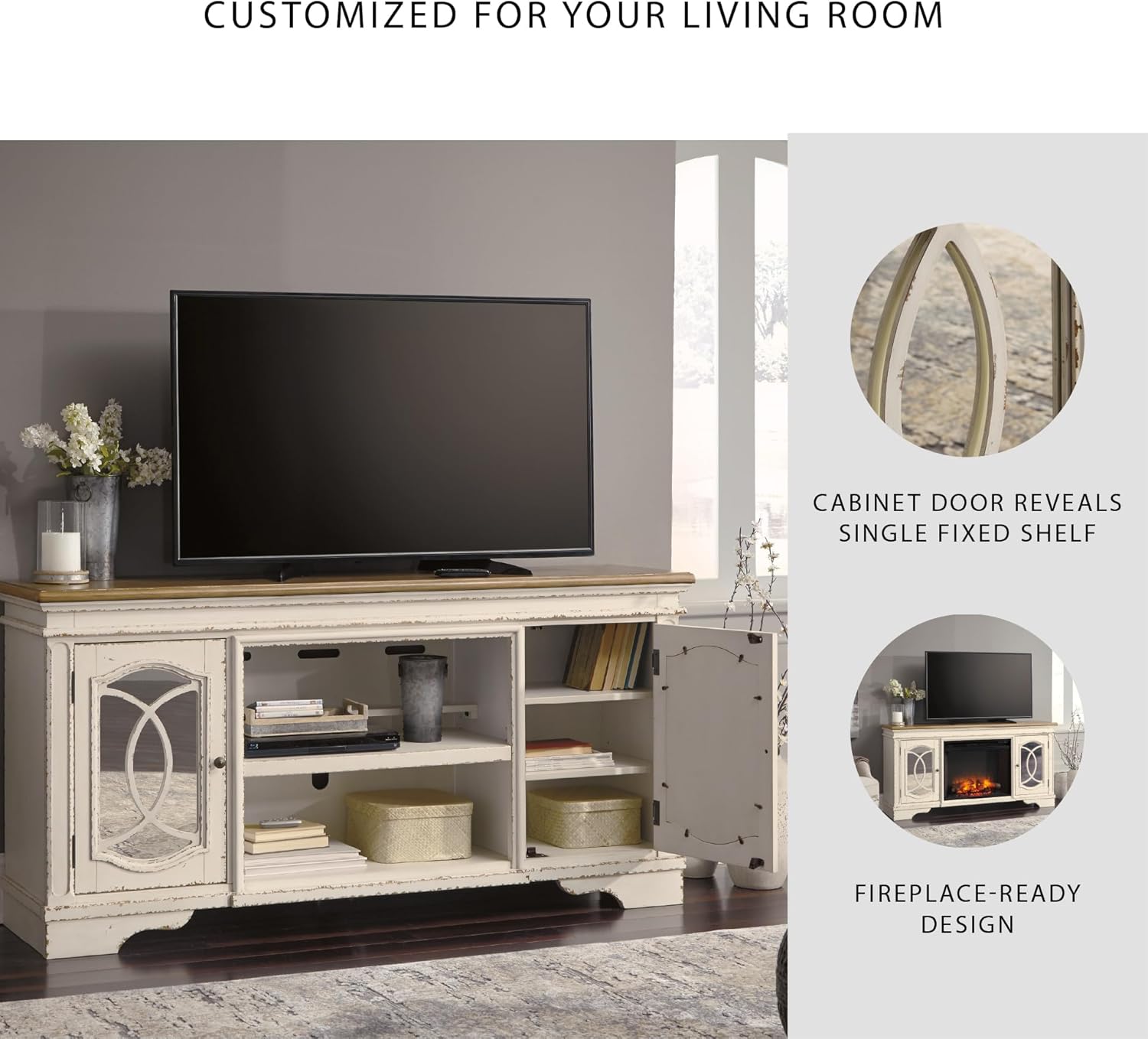 Elevating the art of traditional cottage styling, this TV stand with fireplace option is beautifully in tune with your taste. Antiqued two-tone aesthetic blends a chipped white with a distressed wood tone top for added charm. Cabinet doors’ decorative fretwork over mirrored glass adds a lovely twist. Compatible with W100-121 fireplace insert (sold separately). A stylish TV stand can make your entertaining space a cozy place to relax and recharge. Our entertainment centers provide sturdy support for TVs and other electronics while hiding the wires and cords that could clutter your decor. Whether you're looking for mid-century, farmhouse or other styles, our furnishings include display and storage space, with open and closed-door compartments, drawers and adjustable shelving. And we go the extra mile to package, protect and deliver your purchase in a timely manner.