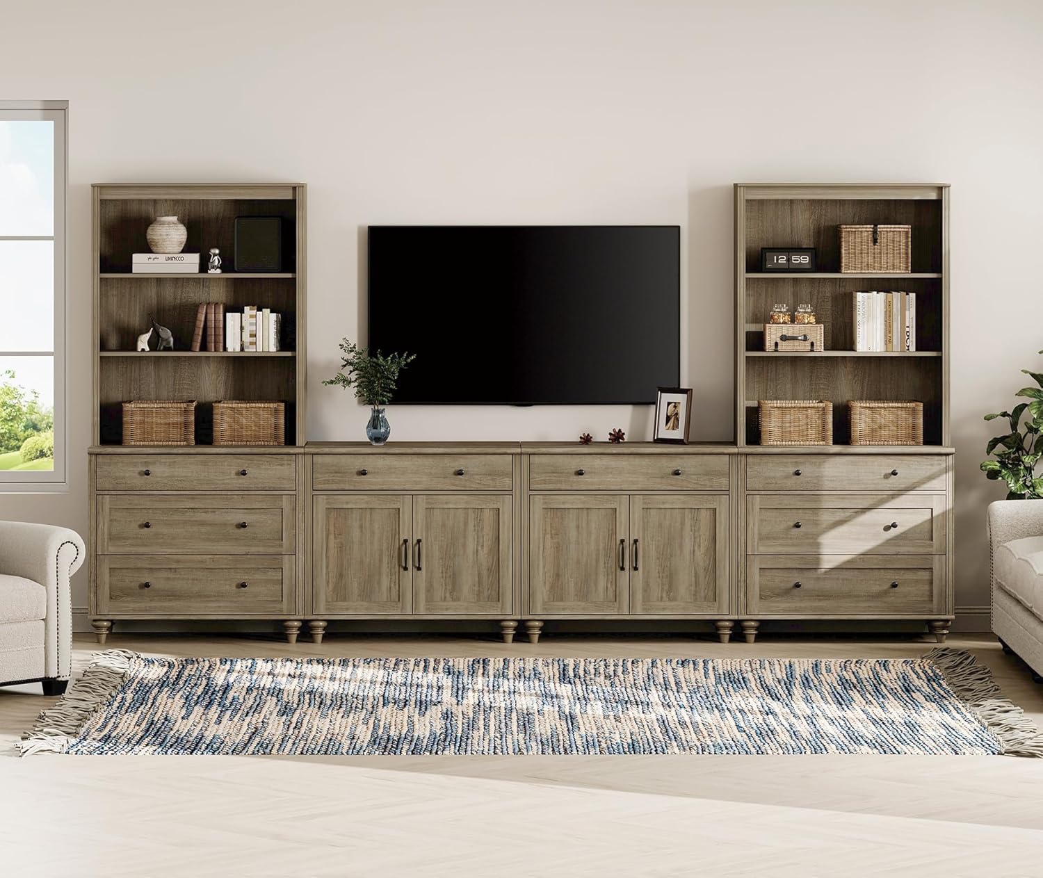 WAMPAT Entertainment Center with Bookshelves for TVs up to 75", Farmhouse Wall Unit TV Stand with Doors & Drawer, Media Console Table for Living Room, Bedroom & Home Theater, Wash Grey