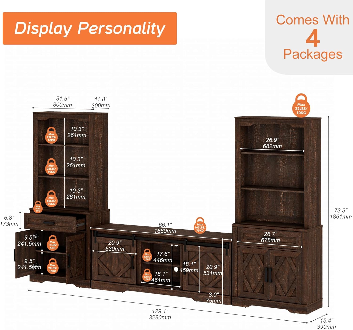WAMPAT Farmhouse Entertainment Center with Bookshelf for TVs up to 75",Mid Century Modern TV Stand with 73"H Tall 5-Tier Bookcase with Open Storage and Barn Doors for Living Room,Bedroom,Rustic Brown